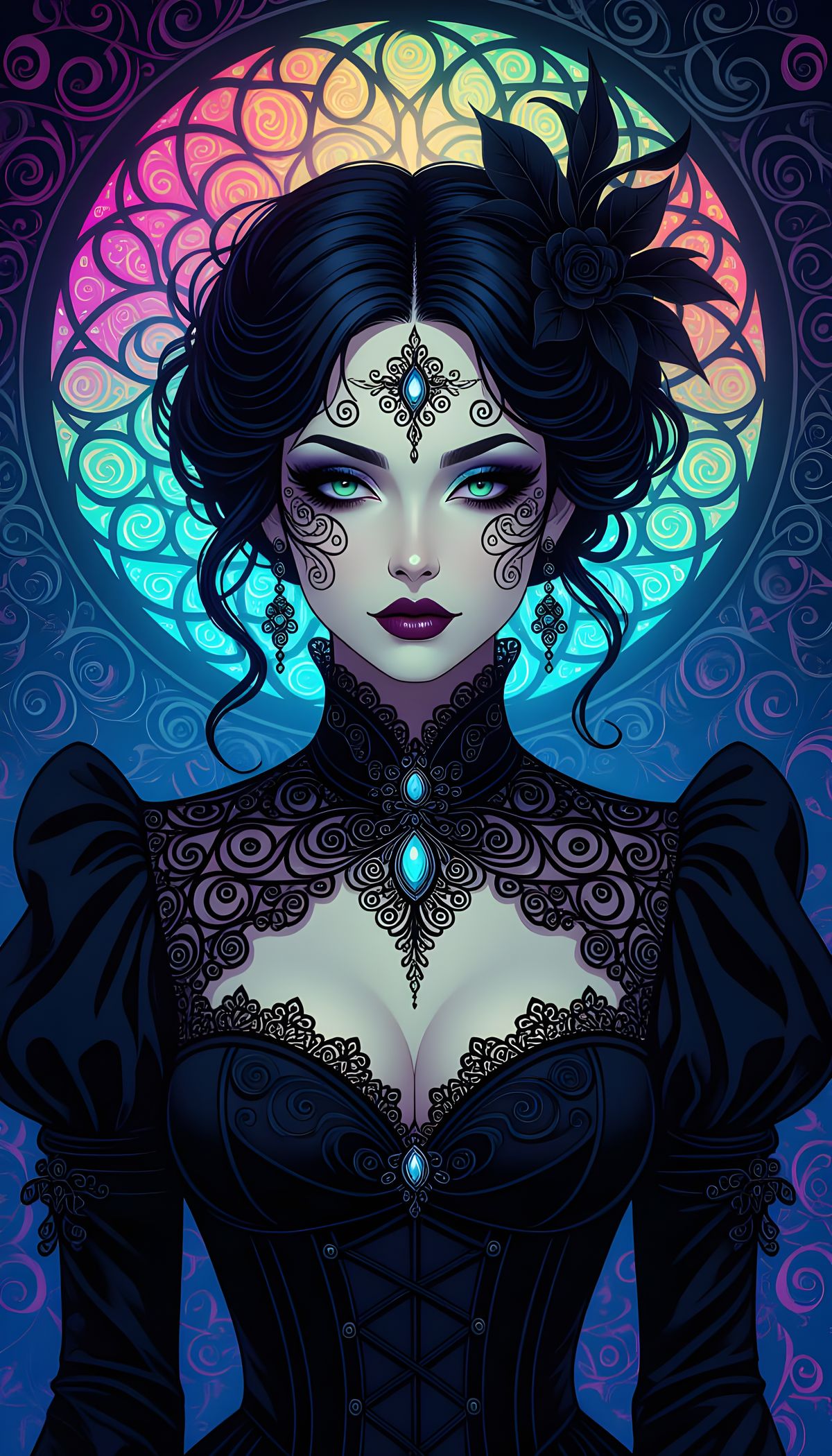This image shows a goth witch with a face of swirling patterns, wearing Victorian-inspired black clothing. The backdrop features shimmering colors, rendered as digital art.