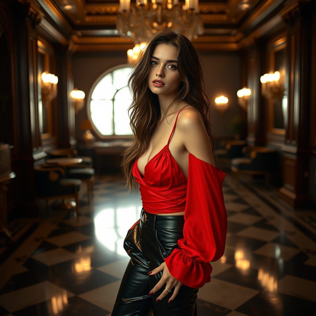 A striking picture of a model in black leather pants and a red top in a luxurious setting. High contrast and cinematic lighting create a moody, hyperrealistic aesthetic.