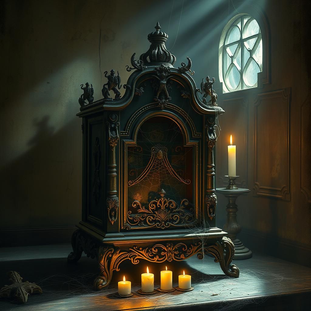 A striking picture of an ornate antique music box in a long-abandoned chamber. Flickering candlelight casts eerie shadows in this scene rendered with dark, mystical realism.