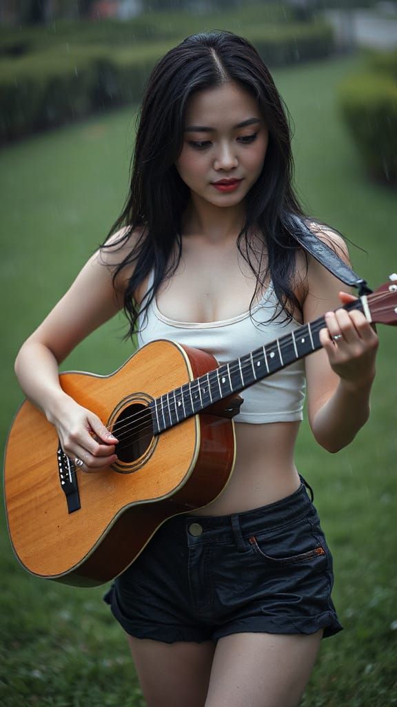 This image shows a beautiful young woman playing guitar in the rain. She is fair-skinned with long, black hair, wearing soaked clothing that accentuates her curves in an intimate and moody setting.