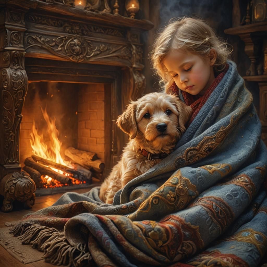 This image shows a heartwarming winter scene of a toddler and his dog snuggled up by a crackling fireplace, captured in a warm and inviting atmosphere reminiscent of traditional folk art