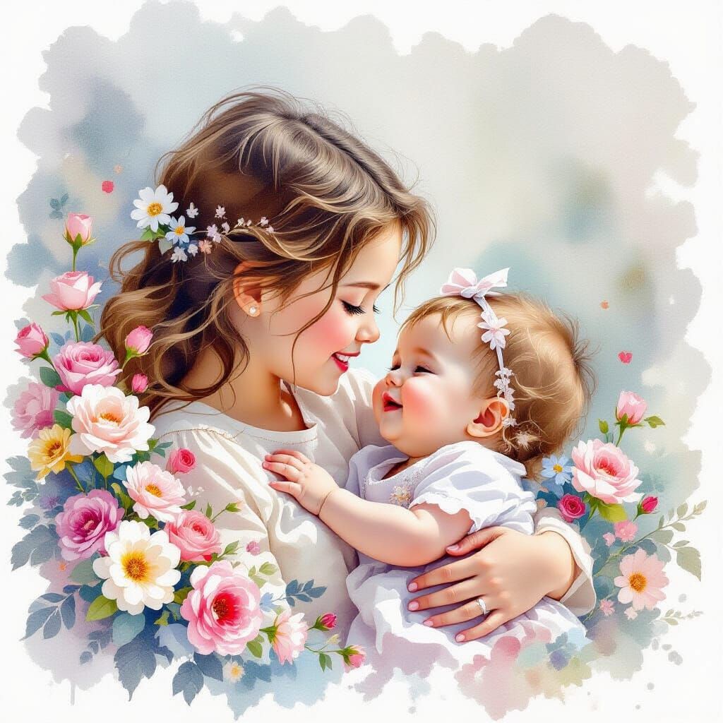 A soft, muted watercolour and ink macro image of a mother, baby brother, and baby sister celebrating Mother's Day, framed by flowers. Features ethereal, hyperdetailed mist and splotchy backgrounds.