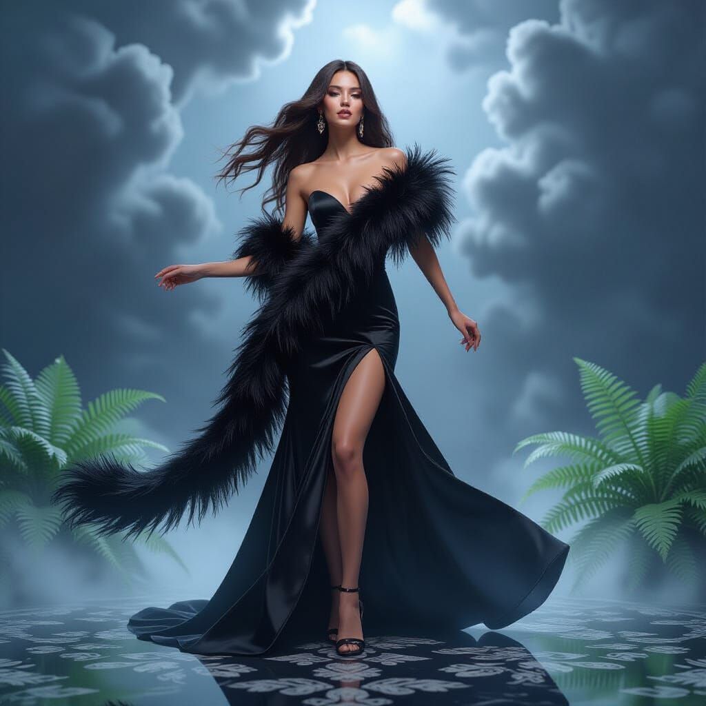 ultra-realistic illustration of sweet realistic slim elegant young European woman with long hair. Long dress and huge feather boa, dancing, black in the clouds, black shiny floor, misty steam from below, white-green ferns on BLUE brocade in the style of hyperrealistic pure white background, limited color ...