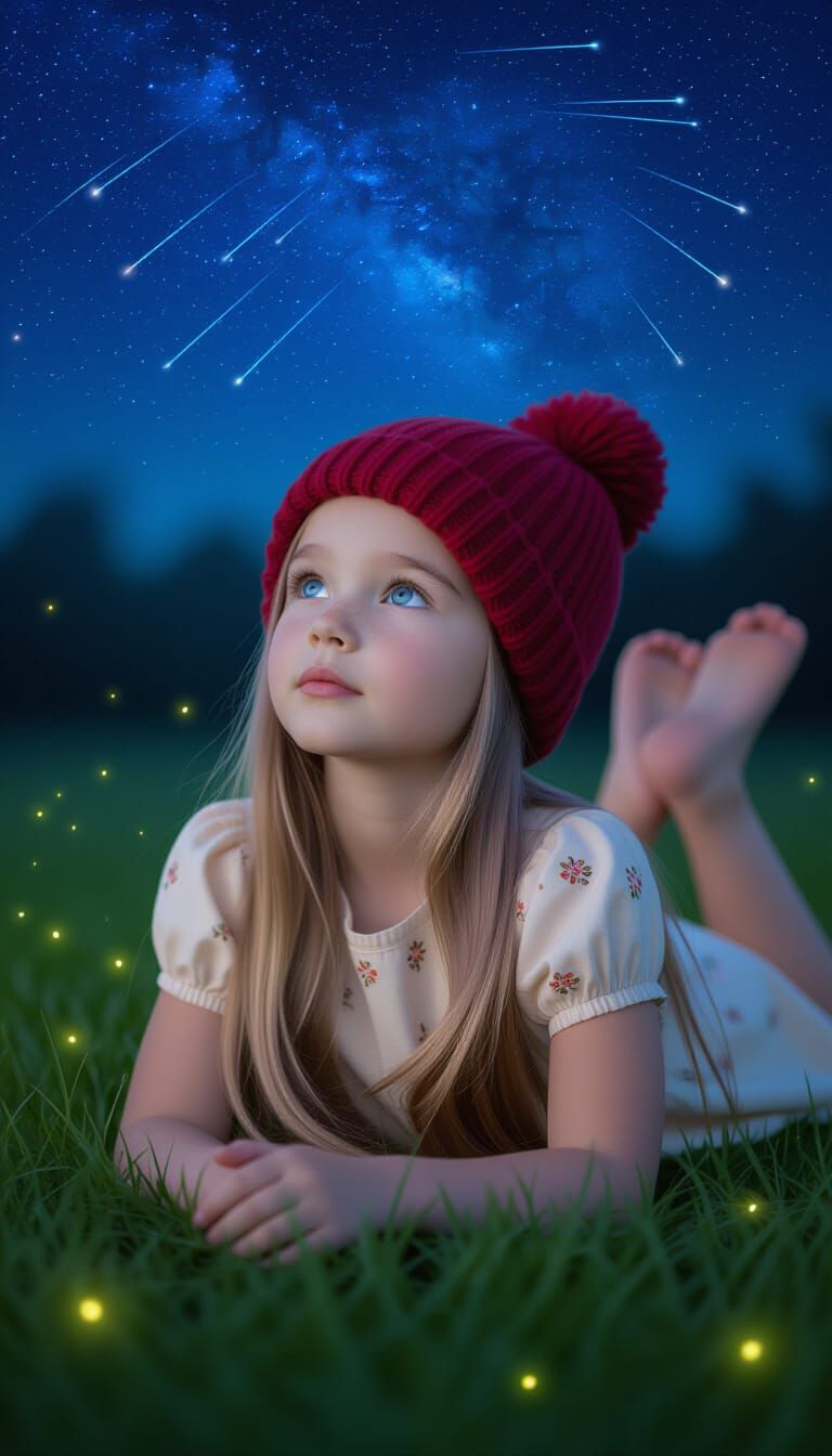 This hyper-realistic photo shows a young girl with long, mauve hair lying on grass under a sky filled with shooting stars and fireflies. A magical, serene atmosphere is created by starlight and mist.
