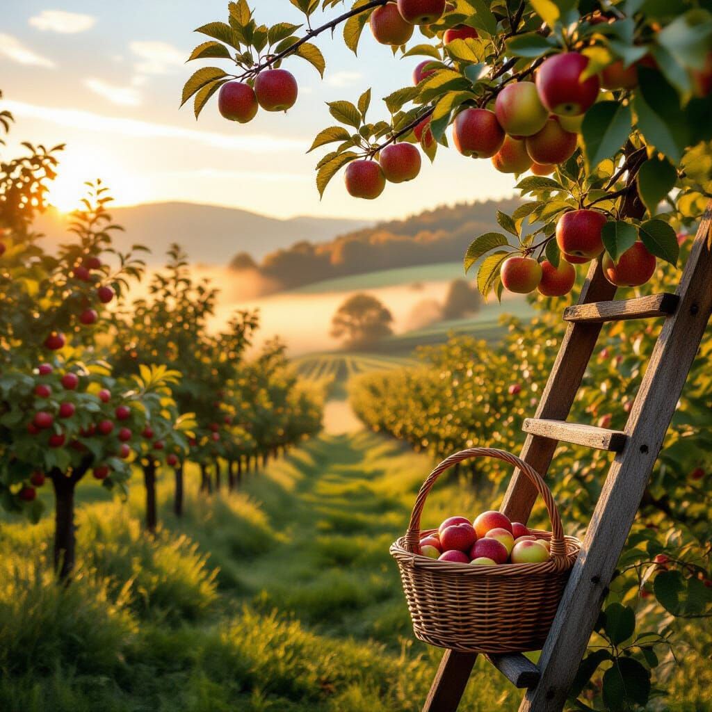 A panoramic view of an apple orchard at dawn, featuring golden-red apples, morning mist, a ladder, and a basket of fruit. Rolling hills in warm autumn light complete the scene.