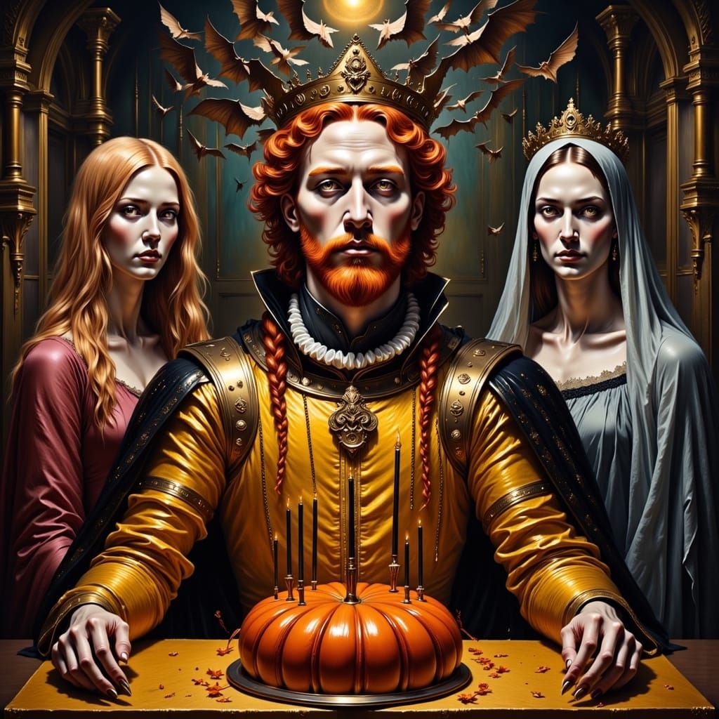 This image depicts Henry VIII in a gilded costume with red hair, celebrating his birthday with a pumpkin cake. Spectral figures of Anne Boleyn and Catherine Howard hover nearby, set against a dramatic, warm and cool color contrast.