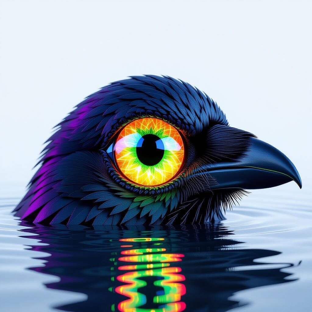 A striking picture of a raven's eye made of shimmering neon in green and orange. The eye is highly detailed with dramatic lighting, resembling a gemstone in hyperrealistic digital art.