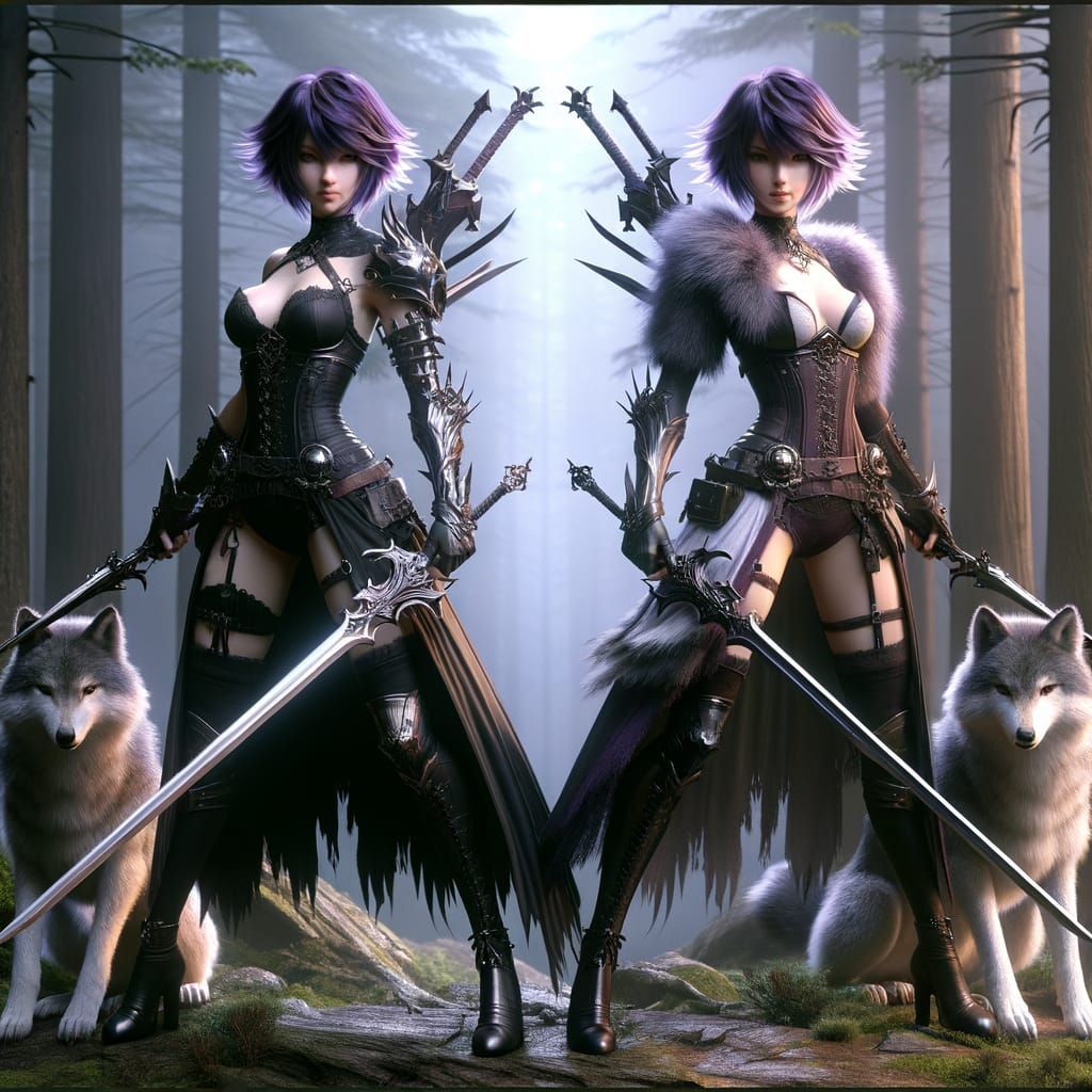 This image shows two gothic female warriors standing in a dense forest accompanied by wolves. The women are armed with dual swords and have short, spiky purple hair, poised and ready for battle in a detailed 8k resolution.
