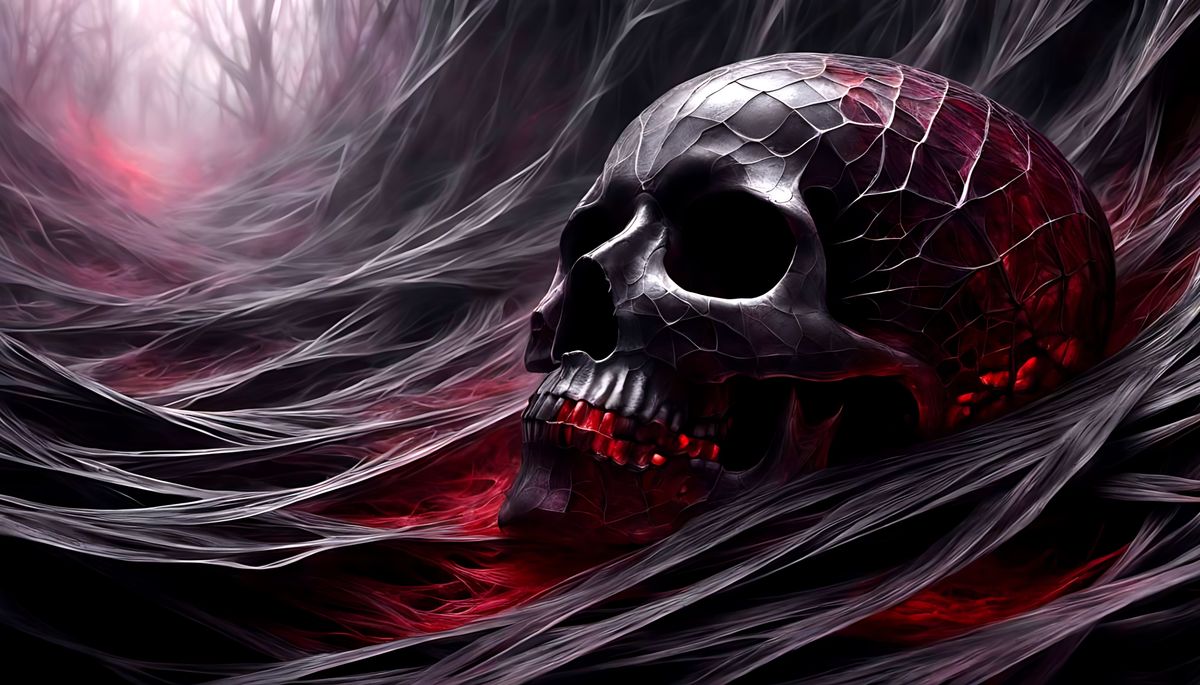 ‘Draped in silken web, and stained by deception’. Hyper-detailed dense charcoal drawing with subtle sanguine red and lavender highlights. Mysterious, unsettling, as perceived by Doré, Rutkowski, and Semenov. Digital 3D, CryEngine, intricately rendered.