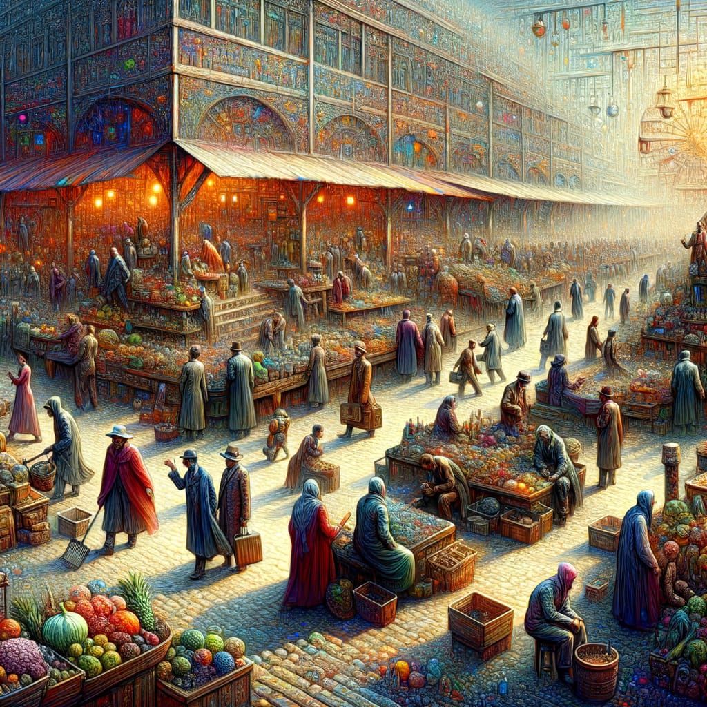A vibrant 8k concept art of a busy marketplace, visually representing economic principles like supply, demand, and competition with deep, contrasting colors.