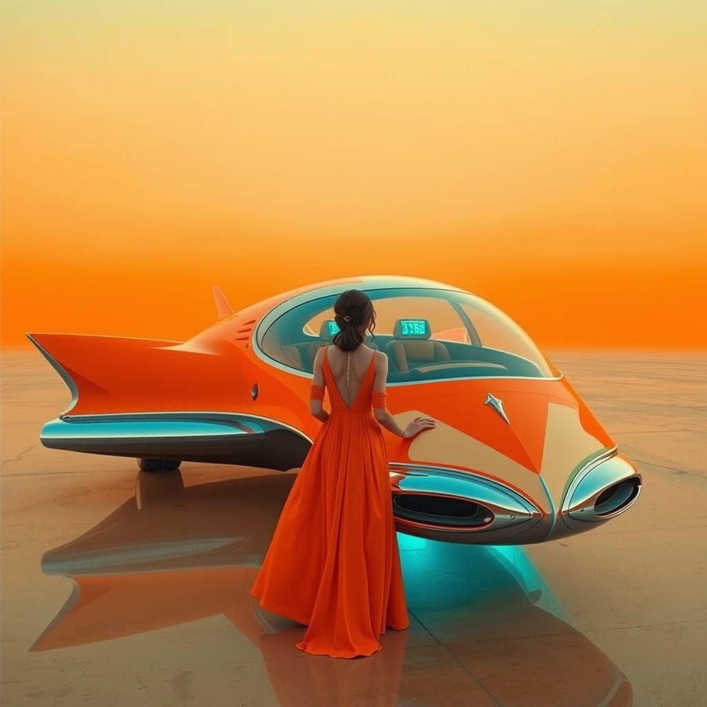 This image features a sci-fi vehicle with subtle chrome plating, rendered in a striking retro-futuristic style dominated by orange hues. It evokes vintage technology with a futuristic feel.