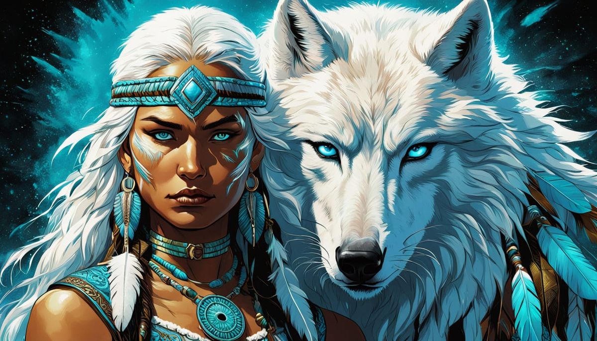 This image shows an American native warrior goddess accompanied by a white wolf with glowing blue eyes. It's a digital painting with a comic book art style featuring turquoise and gold colors.