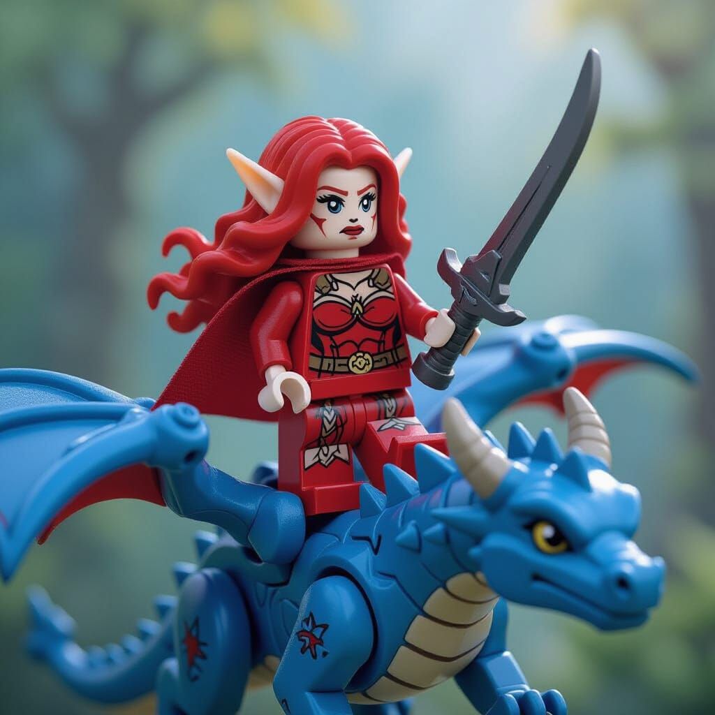 This image shows a Lego-style rendering of a female night elf demon hunter with red hair, clad in red leather armor, riding atop a blue dragon. A vibrant and playful composition.