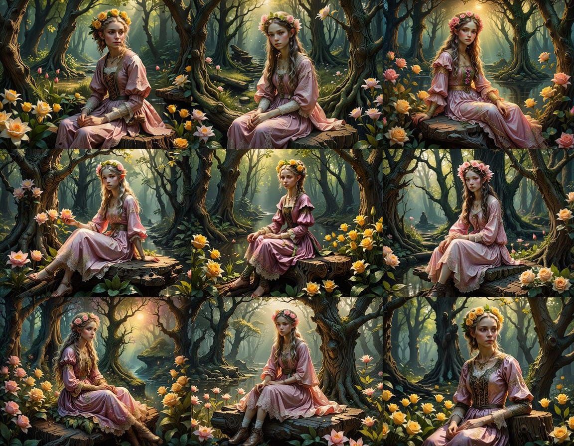 This enchanting digital painting depicts a whimsical lady elf in a serene forest setting, adorned in a pink lace dress and yellow roses headband, with expressive eyes and a gentle gaze.