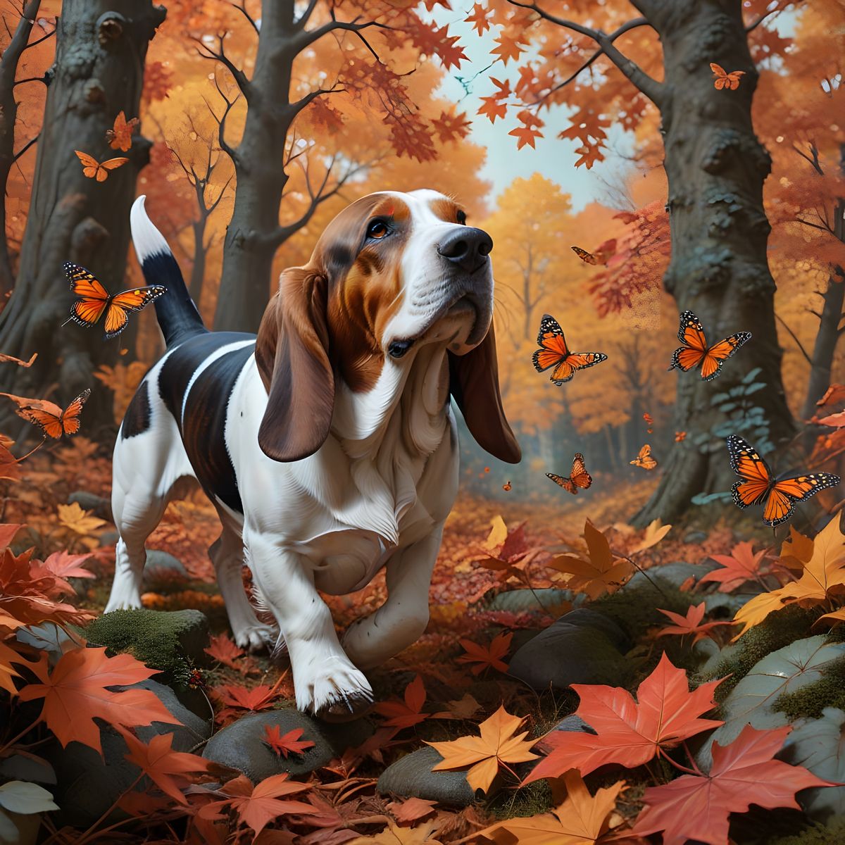 A photorealistic image of a Basset Hound joyfully chasing monarch butterflies amidst a majestic autumn forest with falling red and orange leaves. Masterpiece composition with deep colors and intricate details.