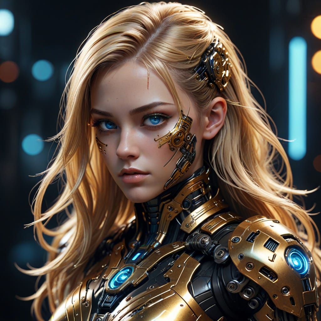 A close-up portrait of a female cyberpunk warrior with intricate gold and black armor, showcasing high-tech beauty and elegant cybernetic enhancements, set against a dark background with glowing mechanical elements.