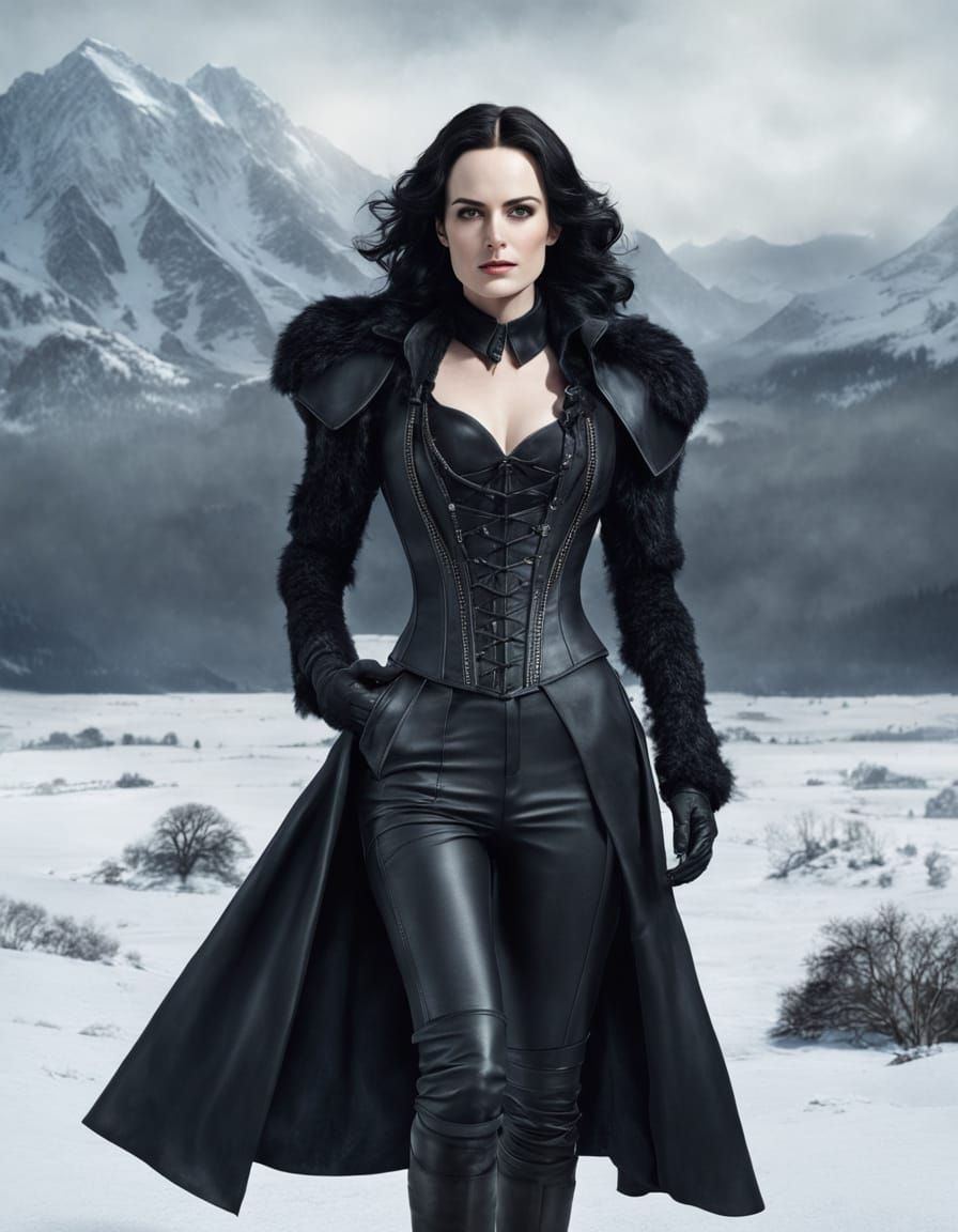 This image depicts a photorealistic portrait of a woman with long black hair, styled in a black satin blouse and leather corset, pants, and boots. The image is sensual and highly detailed.