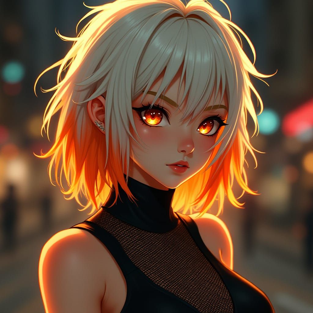 A digital rendering of a confident woman with two-tone hair and amber eyes. The subject is wearing a black mesh top with dramatic lighting in an urban setting, in a futuristic style.