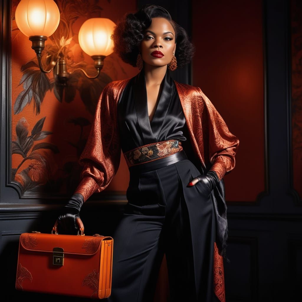 A dramatic, high-contrast portrait of a trans femme woman, dressed in luxurious art deco attire, poses with one heel up on a briefcase, surrounded by smoky, dimly lit atmosphere with warm, golden tones and chrome accents.