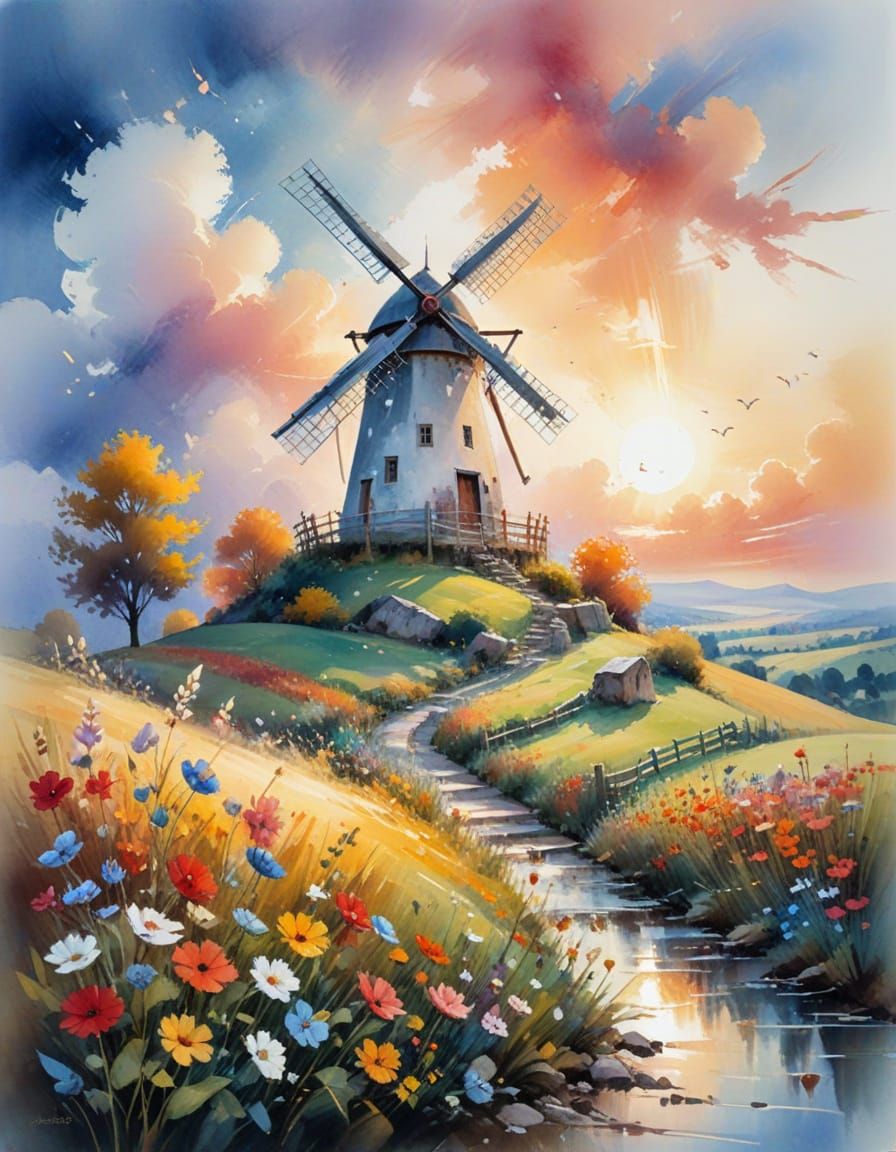 A vibrant neo-impressionistic painting of an autumn windmill atop a hill. The image features a cottage, fluffy clouds at sunrise, wildflower meadows, and a textured path rendered as an impasto acrylic painting.