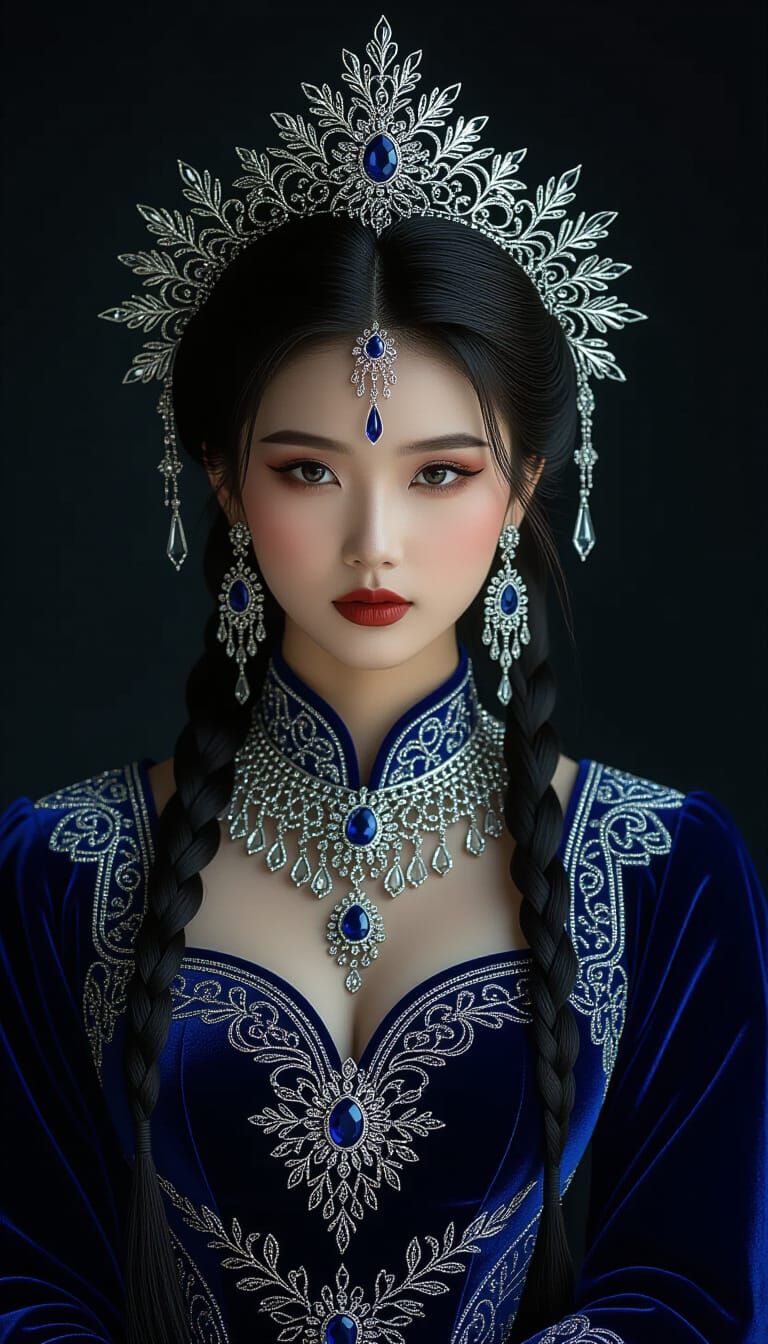 This image shows a regal Hmong queen with a serene expression, adorned with silver jewelry and a sapphire gown. The portrait, reminiscent of baroque art with fantasy elements, features dramatic lighting and rich textures.