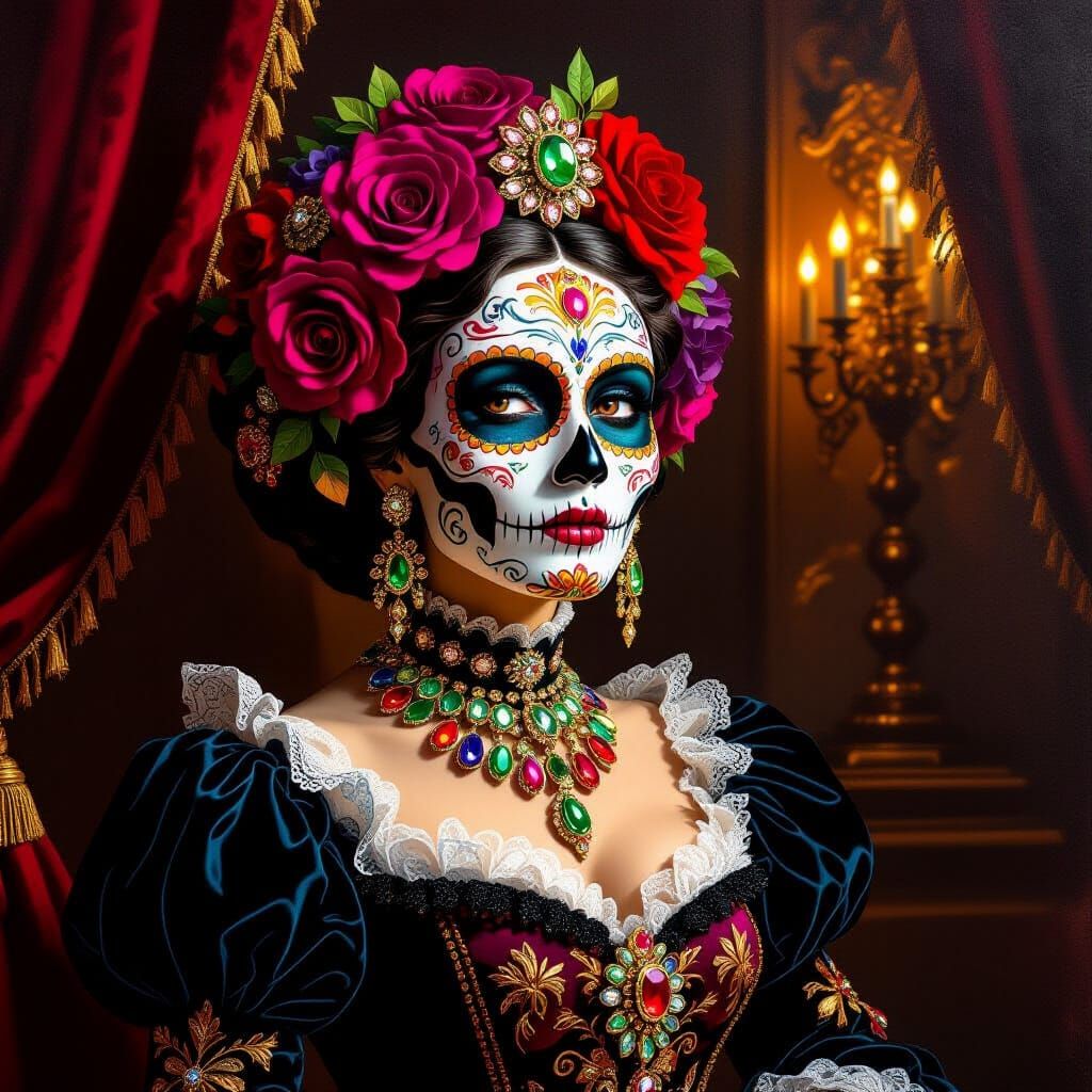 Generate your own unique Baroque Day of the Dead images with our free and easy AI tool. Flexible and fun!