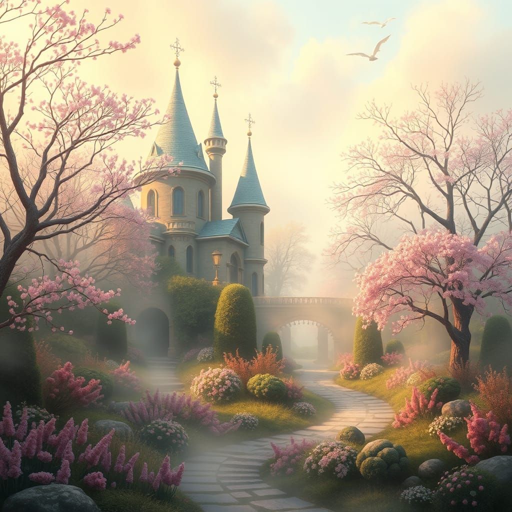 This enchanting image depicts a delicate véranda set amidst a dreamy spring landscape, shrouded in a soft, mystical mist. The romantic, whimsical scene is reminiscent of a warm, fantastical world, with intricate textures and soft focus.