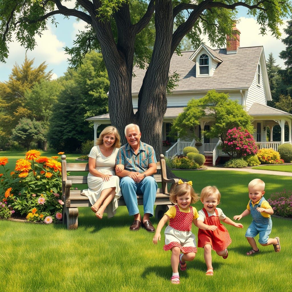 A heartwarming scene depicts parents on a weathered bench in a lush garden while two children play tag on the lawn. The art evokes nostalgic, storybook and idyllic styles.