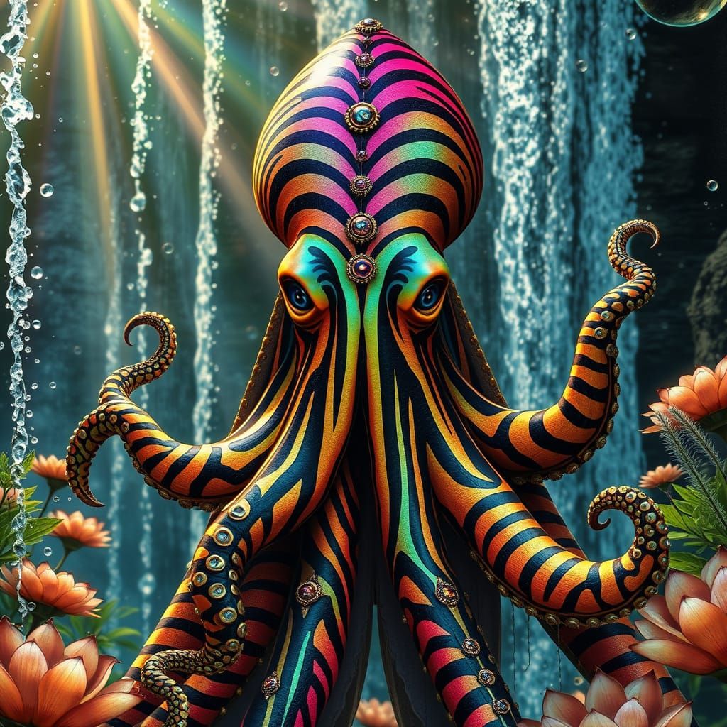 A captivating image of an octopus goddess with striking eyes, adorned in vibrant attire, set within a sunlit garden with a waterfall. The artwork features metallic fractal elements and glowing light rays in a magic realism style.