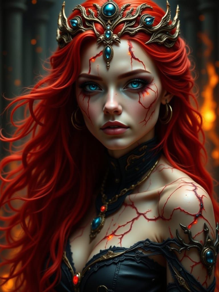 A striking picture of a fire princess with long red hair and cracked skin revealing fire. She wears a jeweled tiara in this dark fantasy art.