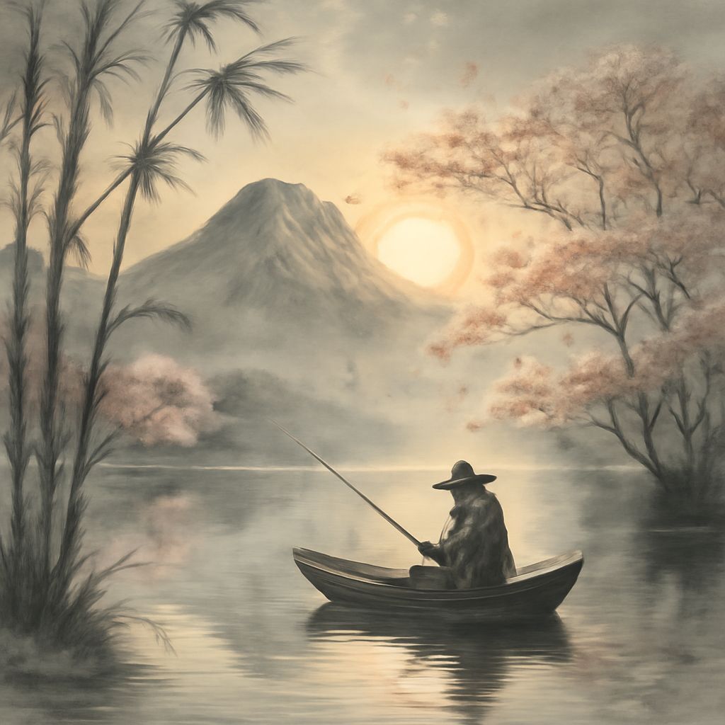 This image depicts a tranquil mountain lake at sunset, with a lone fisherman in a bamboo hat on a small boat. Cherry blossoms drift in the misty air, with reflections on the water.