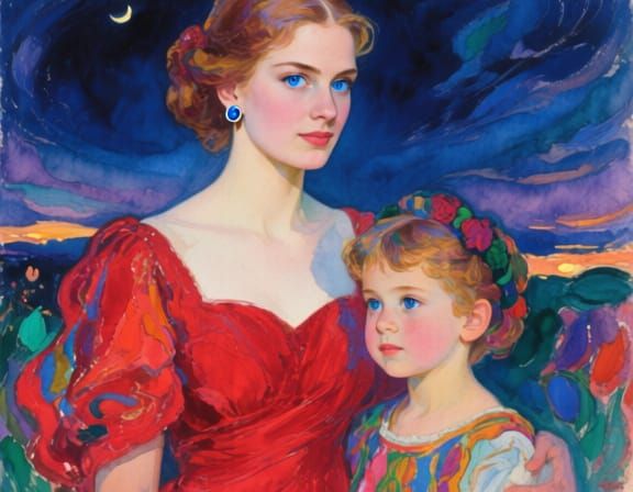This image showcases a young woman in a red dress with blue eyes and a child in a double exposure against a night sky. The artwork features vibrant colors and expressive texture.