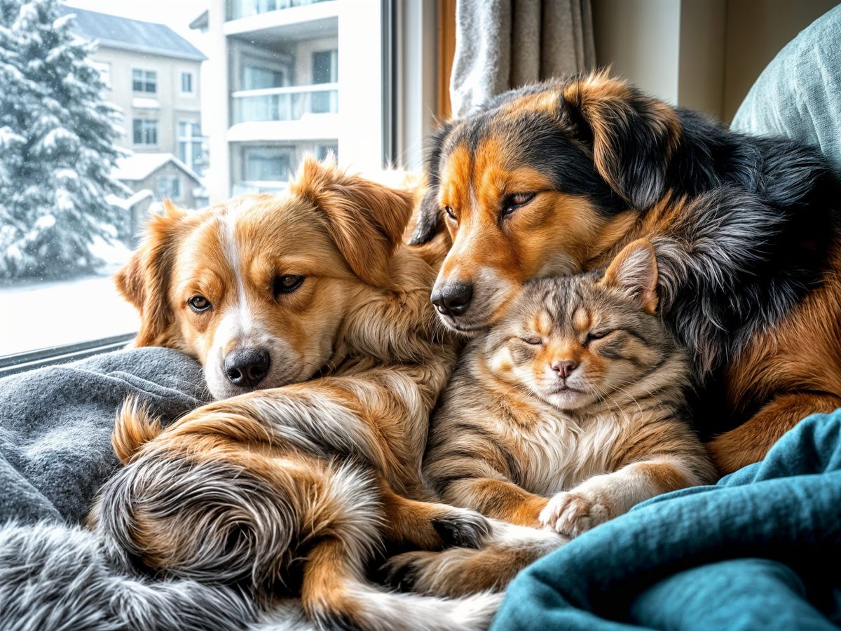 This serene image shows a peaceful moment with pets and a snowy backdrop, inviting contemplation of the beauty around us and finding inner peace.