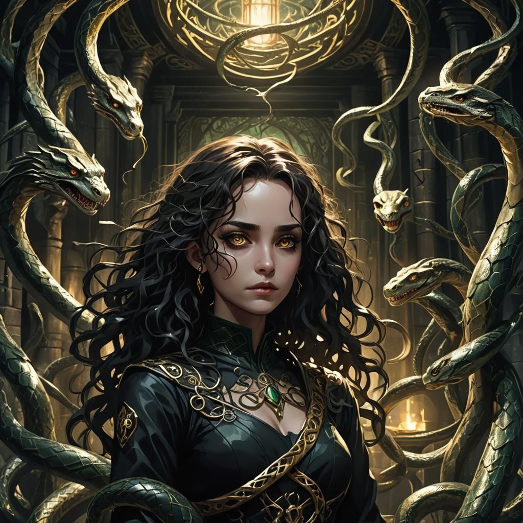 This image depicts a powerful sorceress in a dark chamber, surrounded by snakes. The scene uses high contrast lighting and luxurious dark colors with golden accents, rendered as detailed 3D anime art.