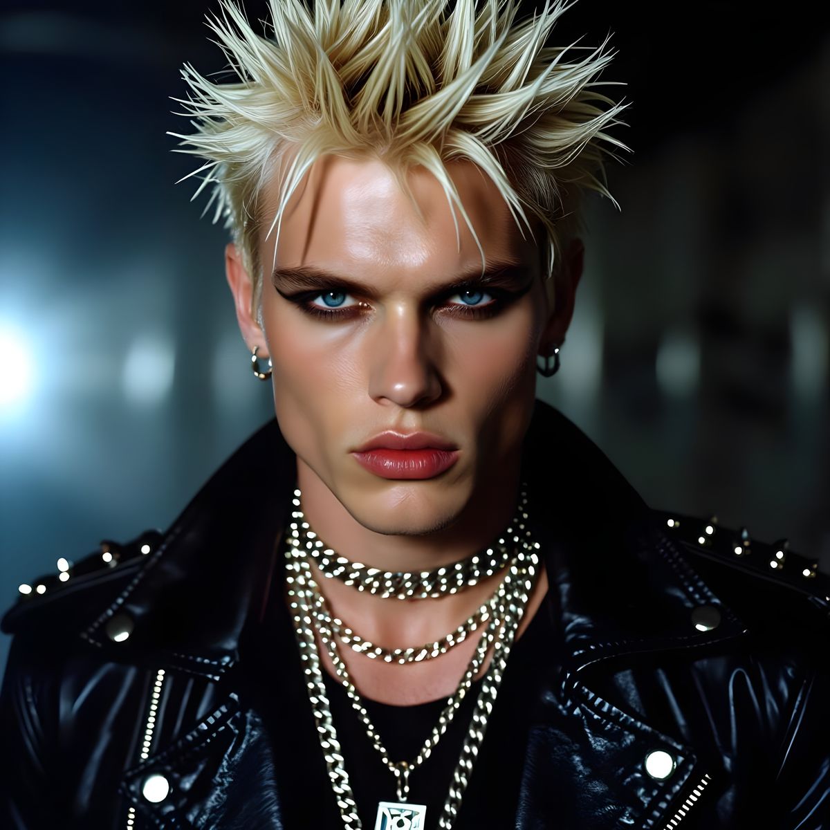 This image shows a close-up portrait of a punk man with bleached, spiked hair and intense blue eyes. He wears a studded leather jacket and silver necklaces in an edgy, rebellious aesthetic.