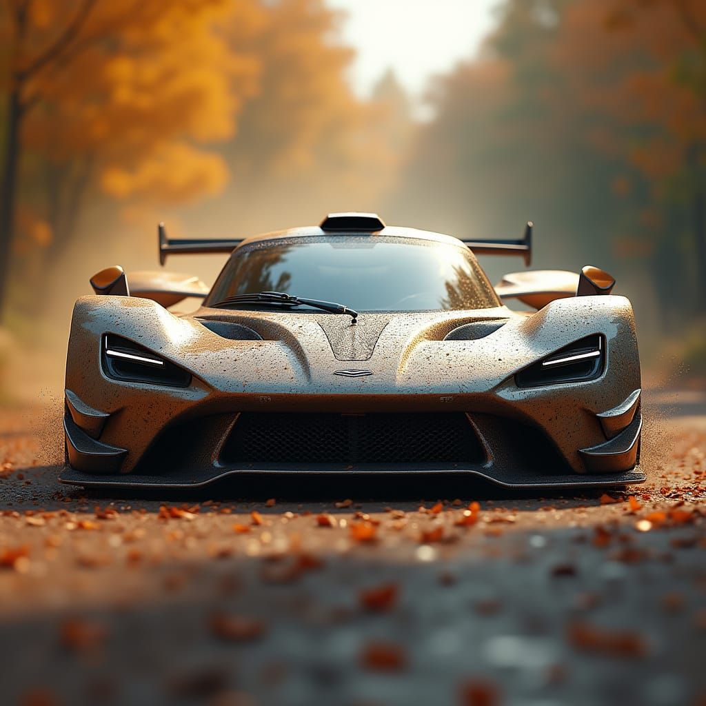 This image shows a sleek, high-performance rally car in a dynamic, high-speed setting, with vibrant colors and blurred trees that evoke a sense of intense energy and competition.