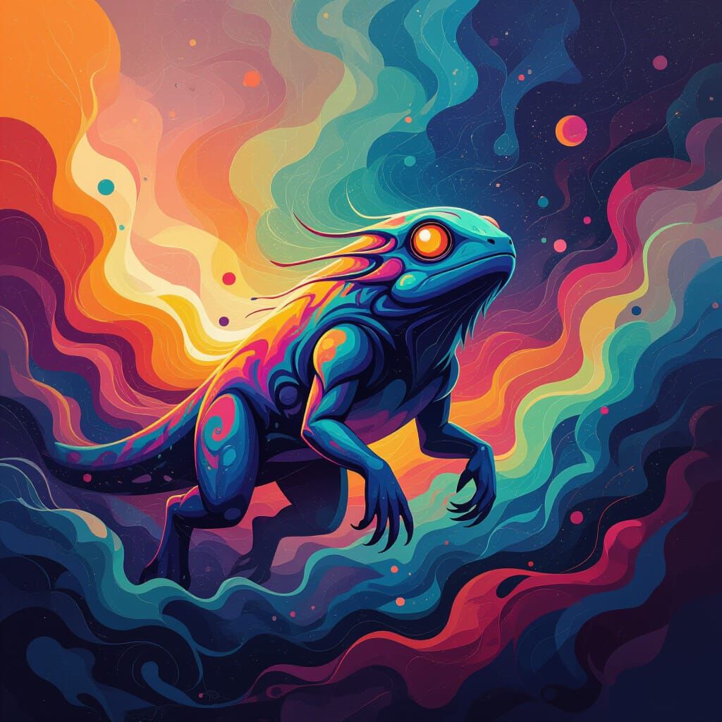 A vibrant, abstract creature stands out against a background of swirling shapes and colors. The image has a futuristic, psychedelic aesthetic.