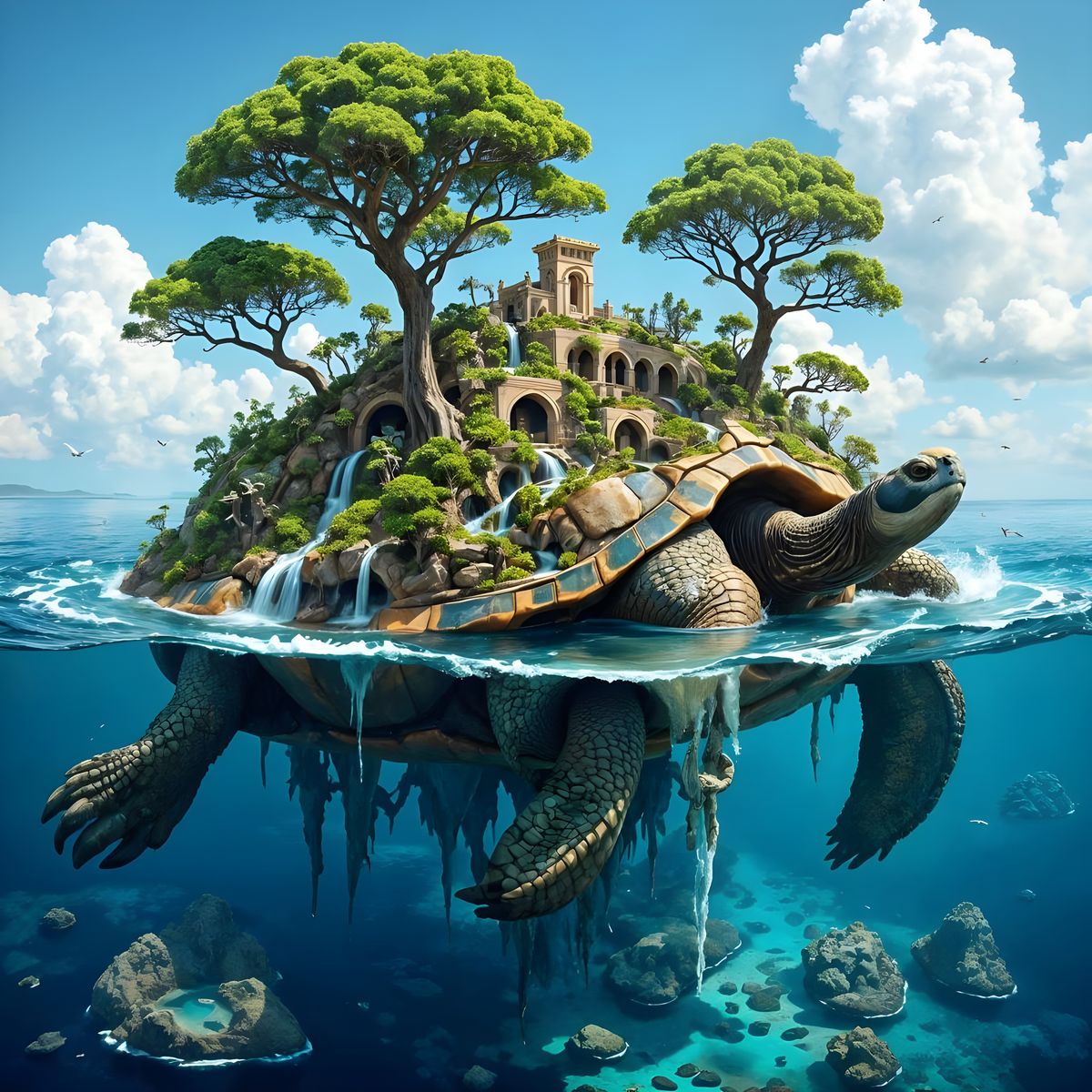 This image shows a giant turtle swimming in the ocean, its shell supporting a thriving ecosystem with trees, waterfalls, and an old roman temple. It evokes a fantastical, atmospheric style.
