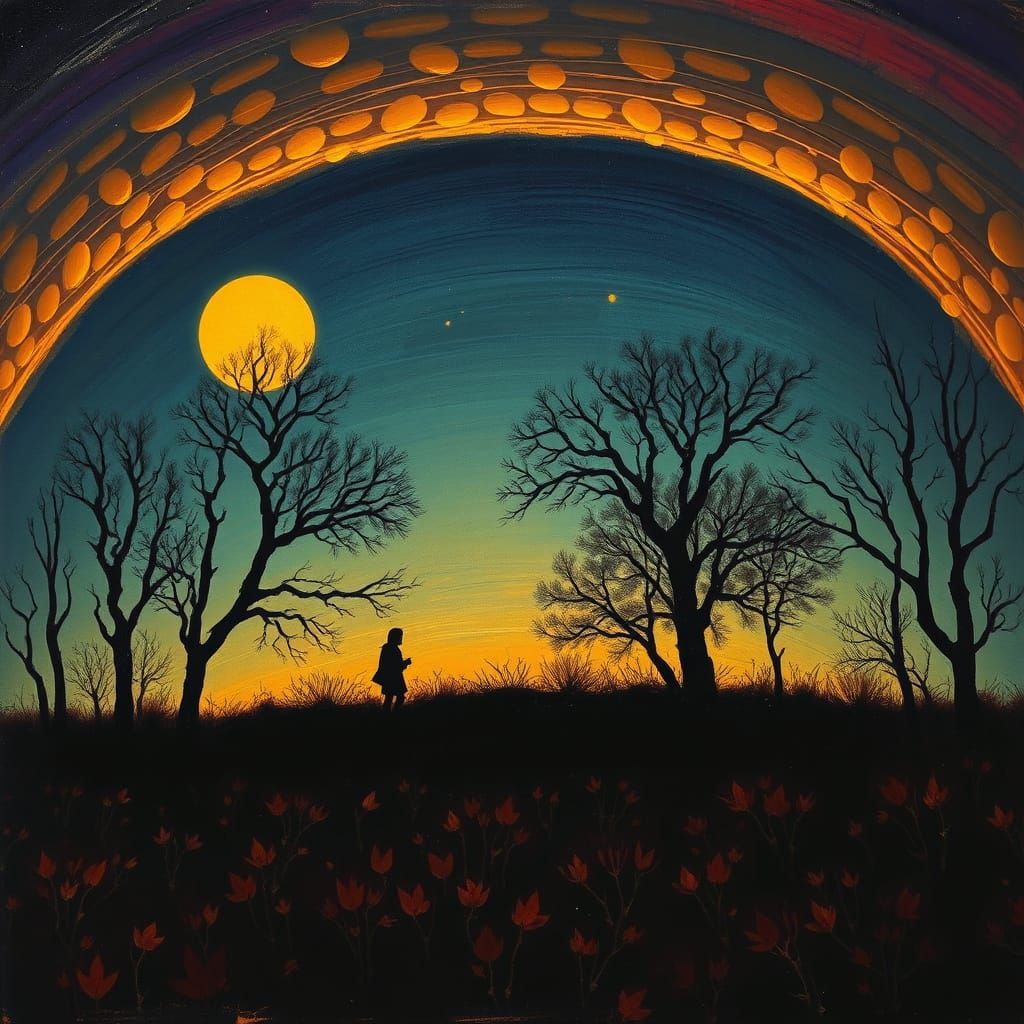 This image captures a glowing autumn scene at dusk, featuring a golden ratio composition with a thick oil patina and glitchcore aesthetic.