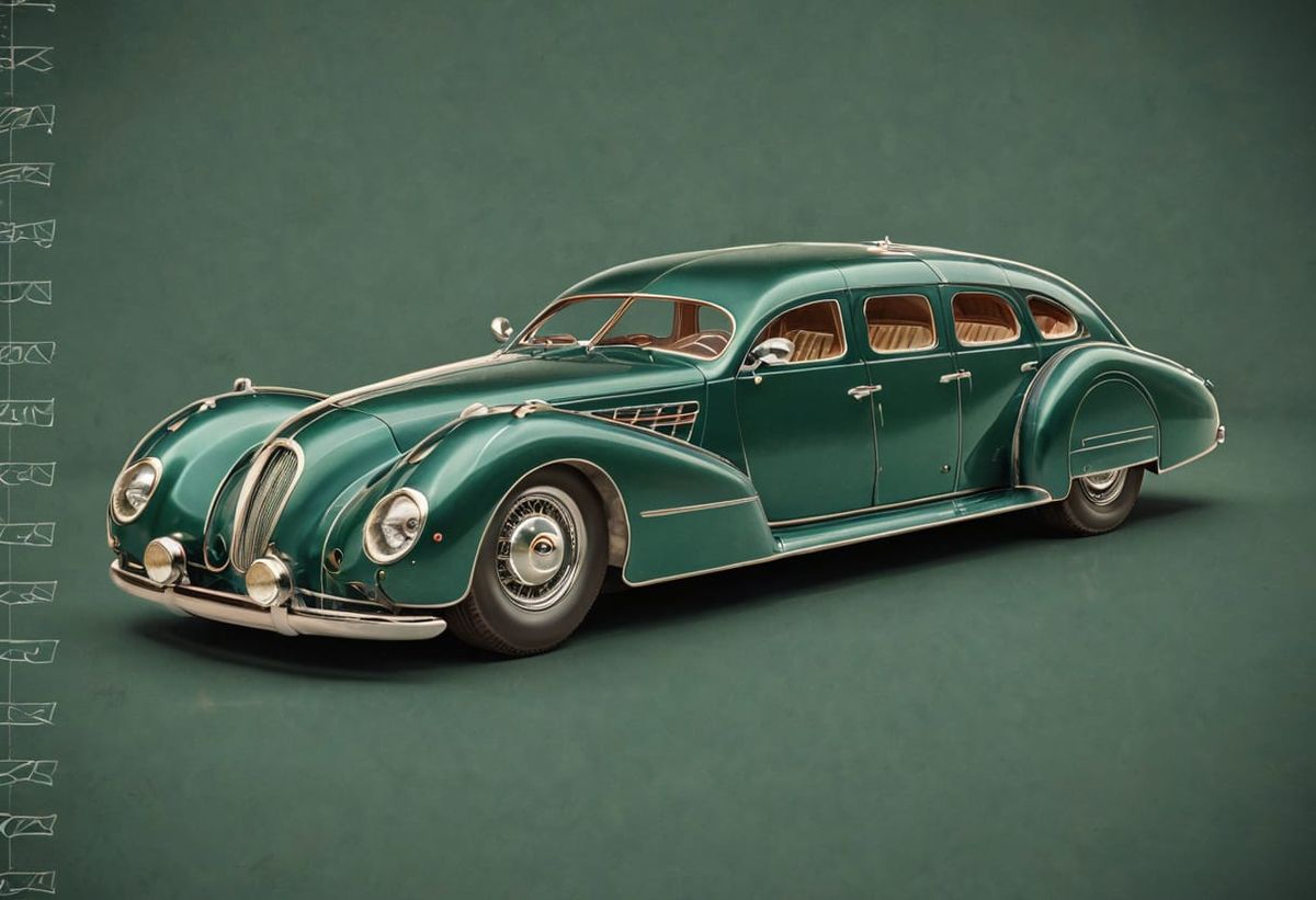 This image showcases a stunning luxury car in a professional studio setting, blending 1930s to 1960s motoring style with modern flair. The car's sleek design and intricate chrome details are set against a vibrant, exotic backdrop.