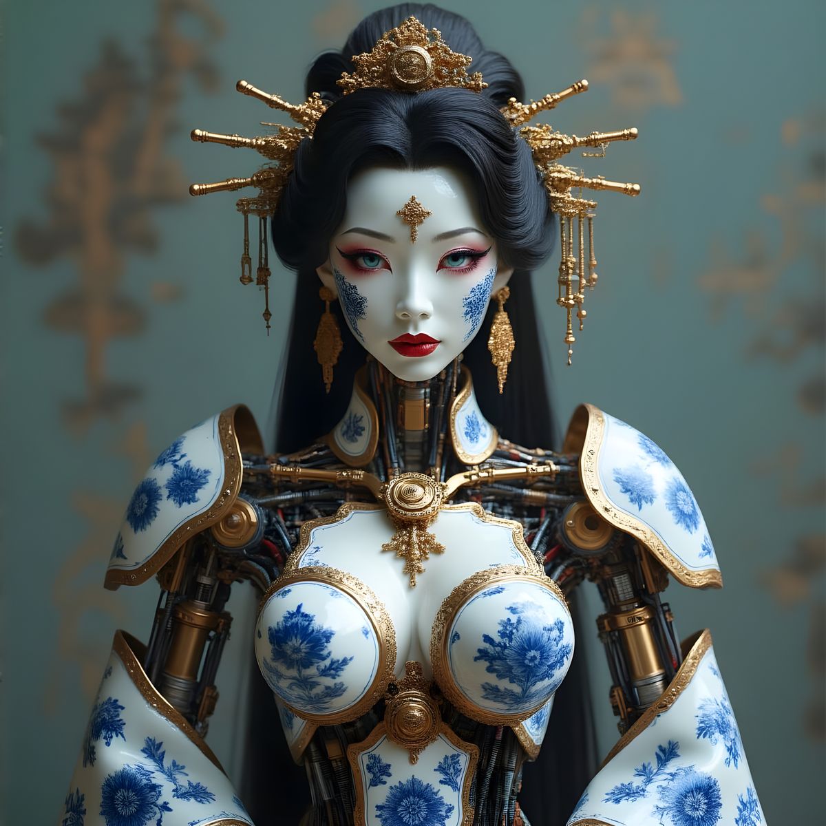 This image shows a full-body portrait of an Asian cyborg princess. She has a regal face, intricate gold fittings, and a body constructed from wires and blue and white porcelain.