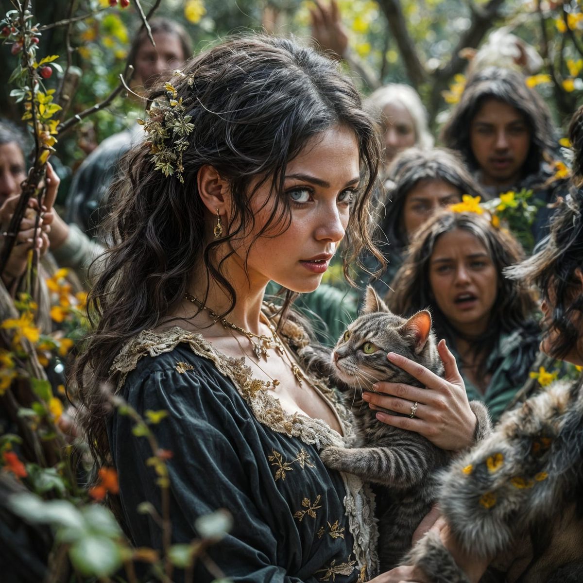 This image depicts a dramatic scene in 1688 as an angry mob accuses a startled woman of witchcraft, with her cat hissing. Created in a Gouache and Watercolor style with thick, textured brush strokes for a hyperrealistic, detailed look.
