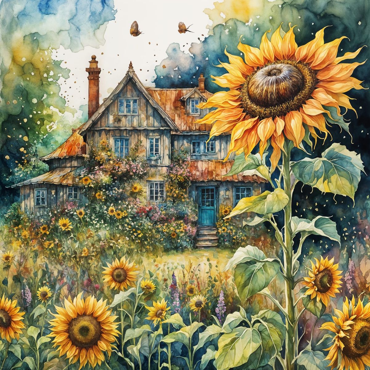 This image shows a snail with a sunflower shell in a lush cottage garden. The illustration features vibrant watercolor and ink techniques, with soft, volumetric lighting and intricate details.