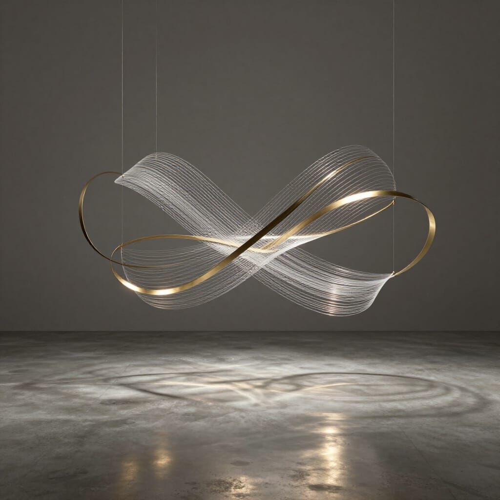 A photorealistic 3D render showcases a suspended kinetic sculpture featuring curved metal ribbons and glass filaments. Soft studio light creates elegant reflections on a concrete floor, with muted pewter, brass, and white tones.
