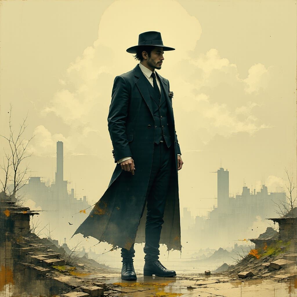 A striking picture of a person in formal wear amid a desolate, war-torn setting. The image evokes a futuristic realism with intricate details and a somber color palette.