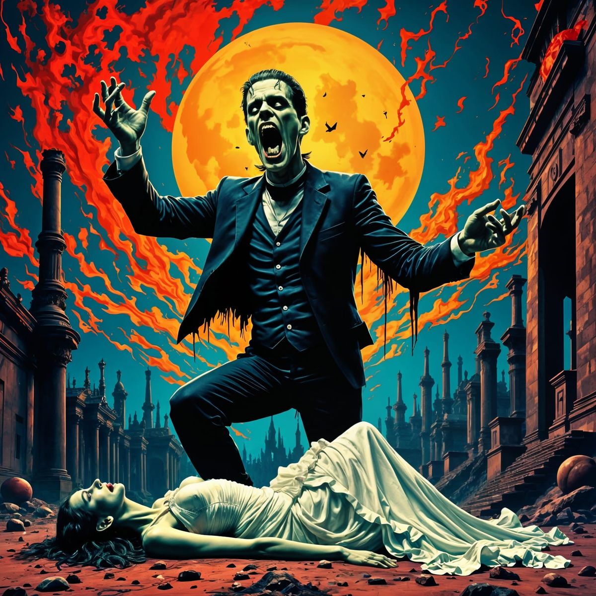 This image shows a dramatic scene of Frankenstein's Monster standing over a beautiful woman in a shredded wedding dress, set in a vibrant pop art style with bold colors and striking composition.