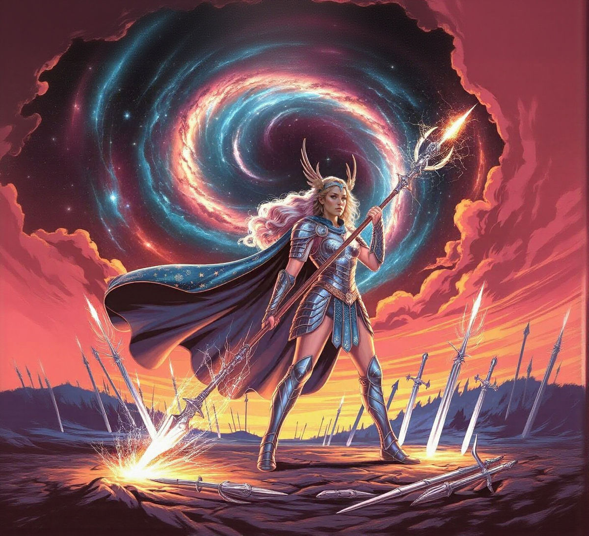 This image shows a Valkyrie warrior on a glowing battlefield. The sky swirls with nebulae, adding a dark fantasy ambiance. Warm colors highlight the ornate armor in a fantasy art nouveau style.