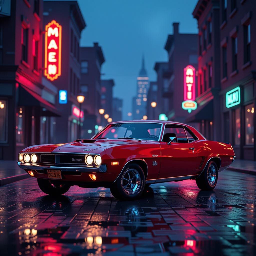 A vintage crimson muscle car gleams on a wet cobblestone street as twilight deepens. City neon lights reflect in puddles, creating a moody, painterly scene with dramatic shadows.