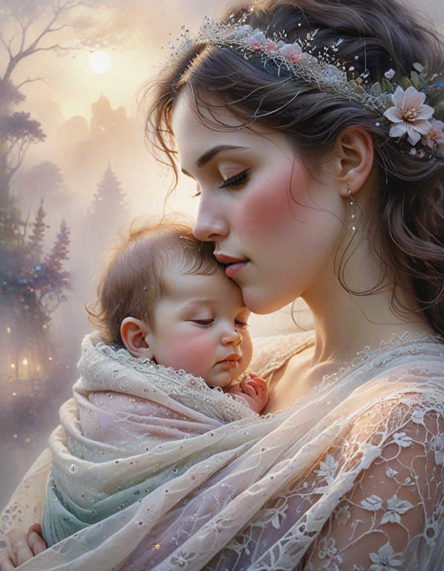A tender closeup of a mother holding her baby, swaddled in lace. Rendered in soft, muted watercolour and ink with an ethereal, misty background.