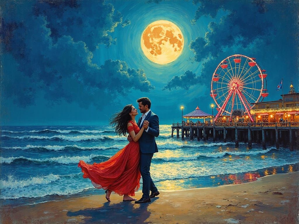 A romantic scene of a couple dancing on a pier under the moonlight. The image is rendered as mixed media painting using impasto techniques, thick textures, and vibrant colors to capture the romance.